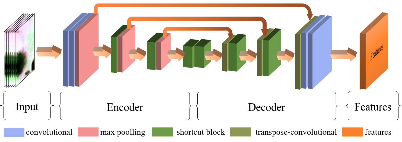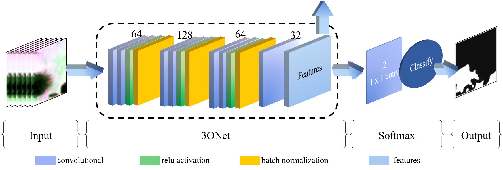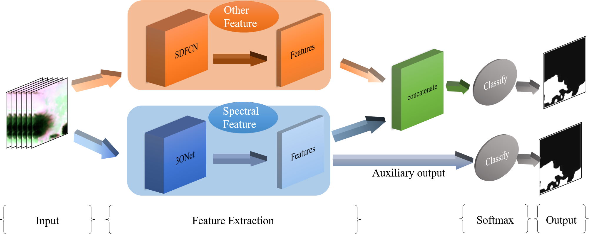 考虑到对流云的提取本质上属于语义分割任务,可以考虑采用全卷积网络(FCN)来进行分类。许多学者都将FCN引入了遥感影像语义分割领域。Chen等人引入了基于FCN模型的SDFCN,其在isprs-vaihingen和potsdam数据集上的性能优于经典的fcn-8s和segnet模型。在本文中,我们基于Himawari-8卫星的数据,设计了一个双流全卷积网络,用于对流云提取任务。我们提出3ONet提取光谱特征并使用SDFCN提取几何特征。