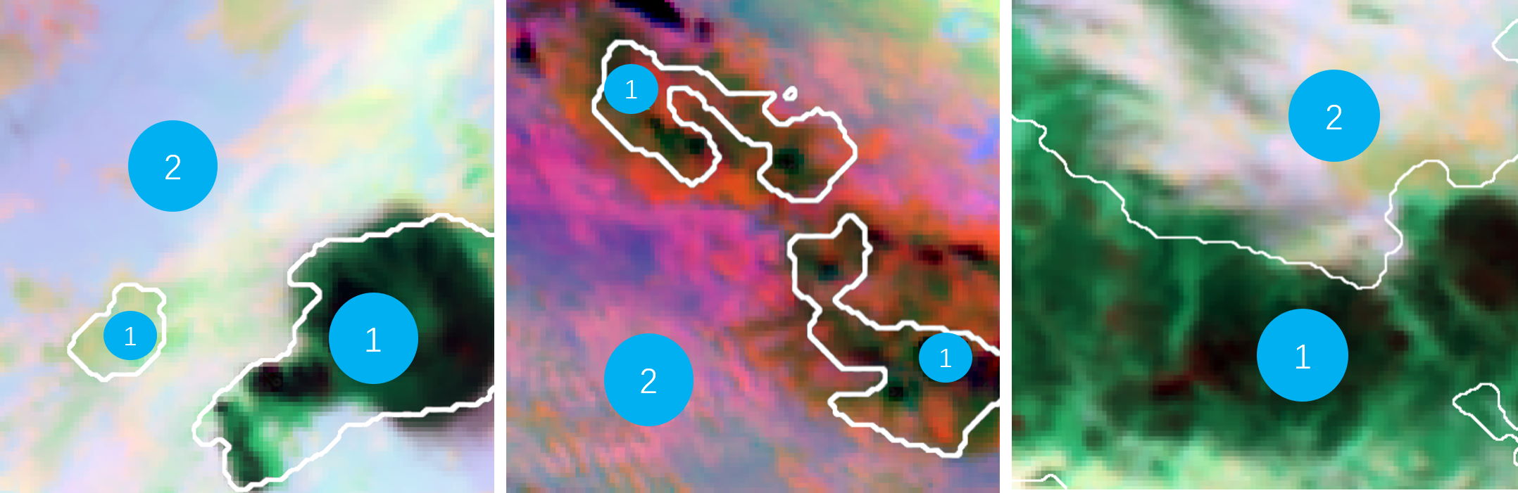 该图像是由葵花卫星的7、9和13波段进行假彩色合成的。标记为1的区域为对流云,2为非对流。它们之间的不同色调表明对流云与非对流区的光谱特征是不同的,光谱特征是相对显著的。