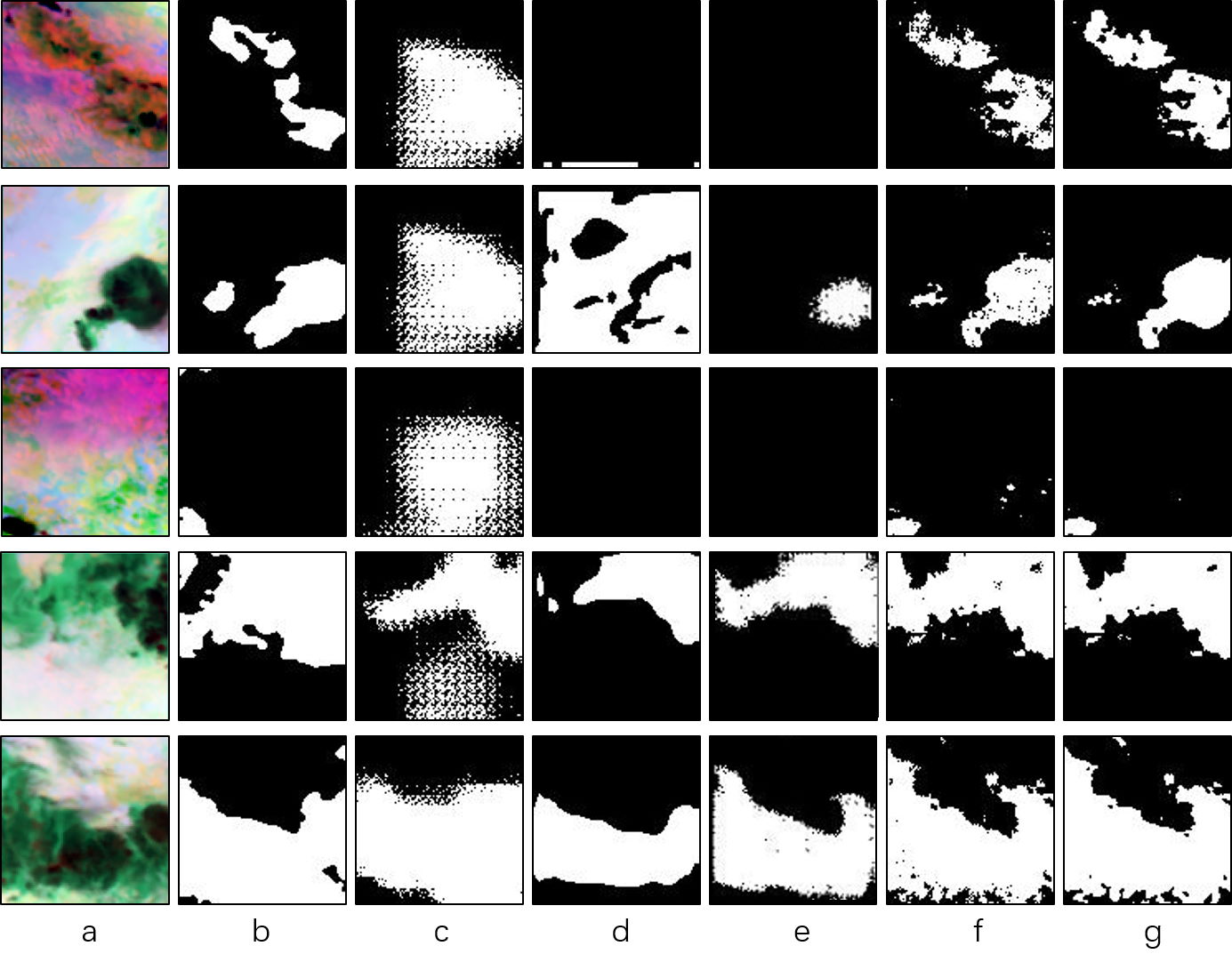 图中,a 是7-9-13波段所形成的假彩色图像. b 是地面真实值, c 是FCN-8s的预测结果,d是PSPNet的预测结果, e是SDFCN的预测结果,f是3ONet的预测结果, g 是双流神经网络的预测结果。b-g中,白色区域为对流云,黑色区域为非对流。