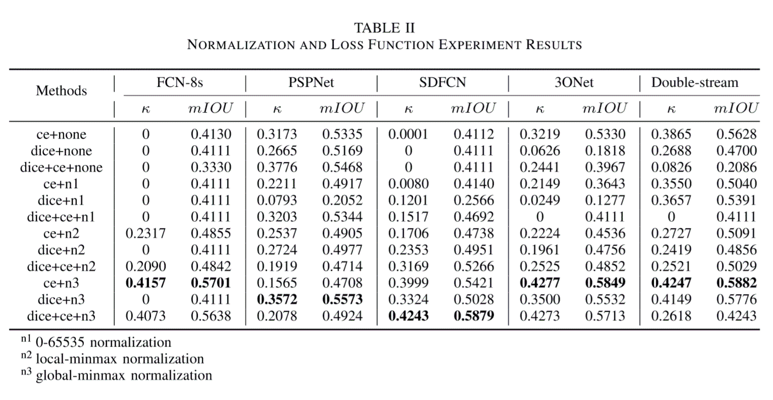 结果表明,我们的3Onet和双流网络在mIoU和K系数方面优于FCN-8s和PSPNet。此外,我们发现归一化方法对结果有很大影响。全局归一化可以有效地提高模型mIoU和K系数。而对于损失函数则没有比较容易总结的规律,不同的模型可能有着不同的适宜的损失函数。