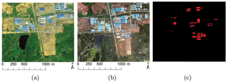第二组数据的两时相影像取自于湖北省遥感影像。数据覆盖范围为615m×586m,主要地物类别包括建筑物、种植农田、植被和道路。有三种主要形式的变化: