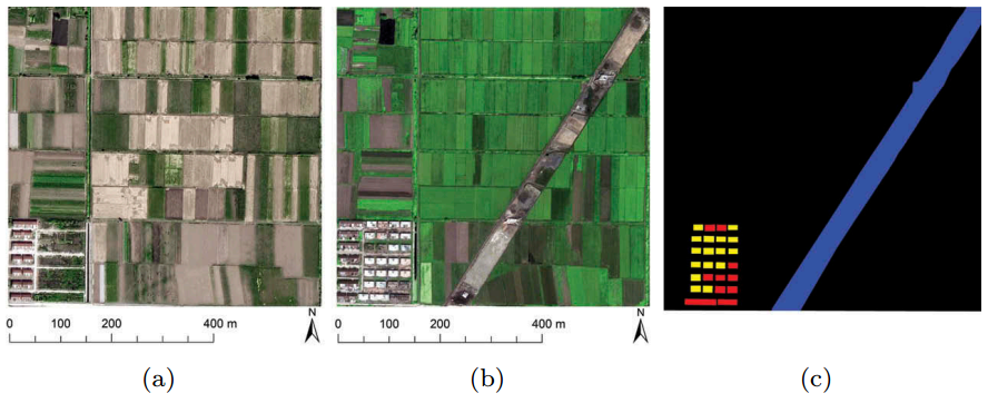 - C变化,从农田变化为道路,如图3(c)蓝色区域所示