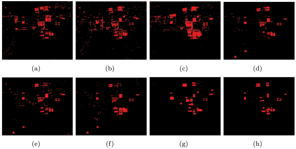 在第一组实验中,如图4所示,其中图4(a),4(b),4(c)分别表示利用CVA,OBCB和PPC方法得到的变化检测结果。图4(d),4(e),4(f)分别表示利用深度学习的方法如SAE,CNN和LSTM得到的变化检测结果。基本本文所提出的MFRCNN和SFRCNN得到的变化检测结果分别如图4(g),4(h)所示。由于传感器的差异,前三种传统方法与后五种基于深度学习的方法相比有更多的错误检测。与其他三种基于深度学习的方法相比,我们提出的方法进一步减少了伪变化,特别是在图4的左下方。