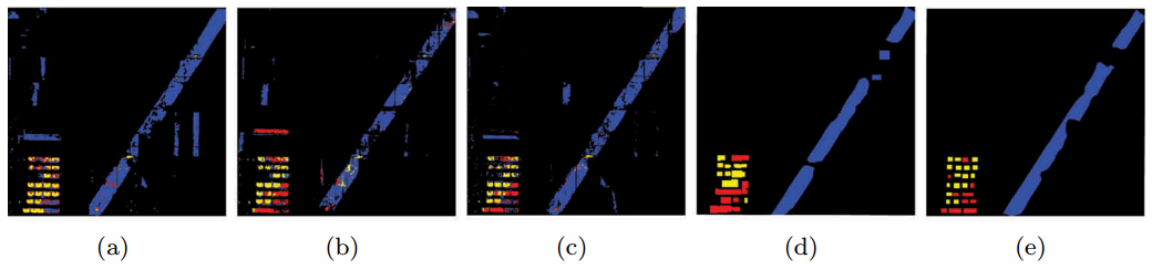 在第二个实验中,我们需要检测土地利用变化的类型。因此,我们放弃了繁琐的传统方法,直接比较基于深度学习的方法。图5(a),图5(b)和图5(c)分别表示利用SAE,LSTM和CNN得到的结果。基于Faster-RCNN的变化检测结果如图5(d)和图5(e)所示。根据表2精度比较结果,基于FasterRCNN的OA和kappa系数均有提升,其中SFRCNN的性能更好。