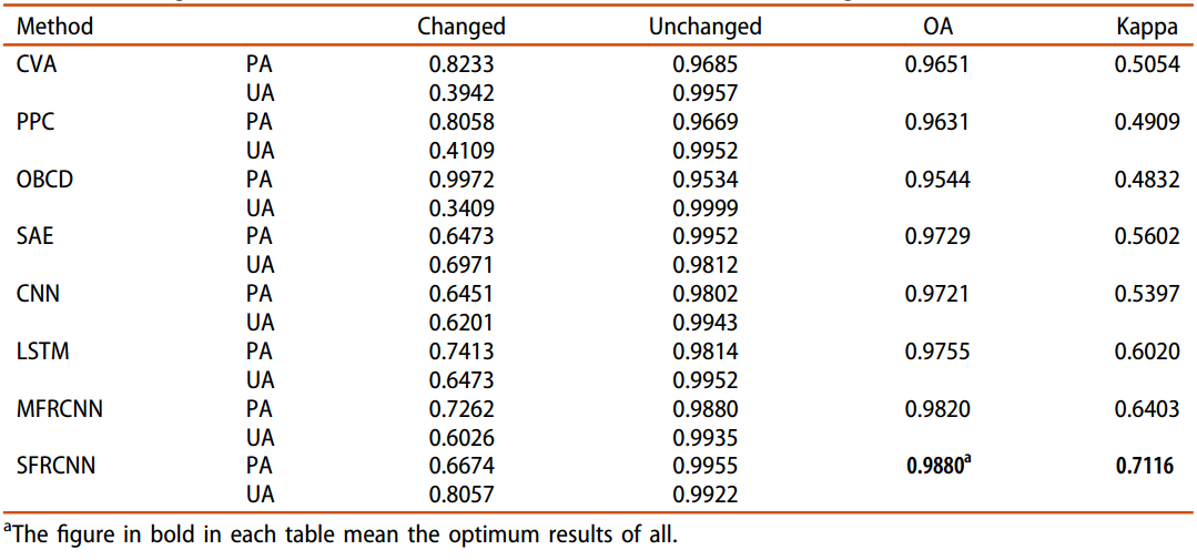 不同方法的PA、UA、OA、Kappa系数的定量分析如表1所示,基于深度学习的方法比传统方法获得了更好的变化检测结果。基于Faster-RCNN的两种方法提高了OA和kappa系数,其中SFRCNN的性能更好。