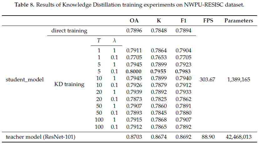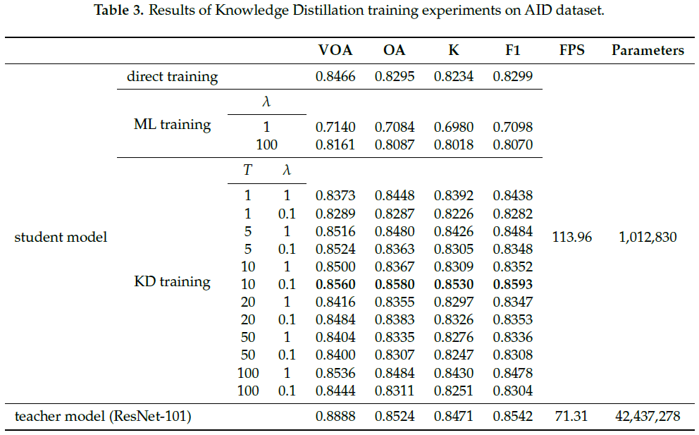 本文首先在AID数据集上开展实验,验证知识蒸馏方法的适用性,并探究了温度值(T)与损失比重值(Lambda)对精度的影响,结果如表3所示。