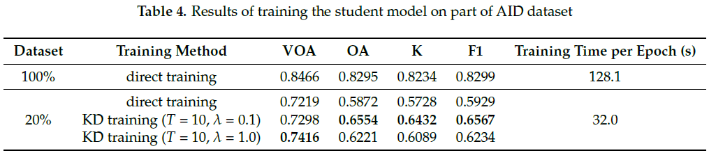 从表4可以得出,小数据集可以缩短训练时间,但训练结果较差,但在这种情况下,KD训练仍比直接训练效果更好。