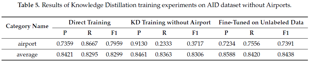 从表5来看,在没有“机场”样本的情况下,KD训练过程仍然比完整数据集的直接训练获得更好的F1值。从蒸馏模型的角度来看,在训练时从未见过“机场”样本。然而,它具有高精度,与低召回率。如果我们通过知识蒸馏继续微调学生模型上未标记数据,机场的F1值可从0.3717增加到0.7391。