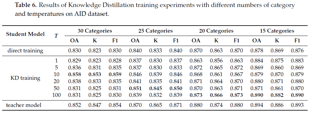 在AID数据集上,本小组还探究了场景类别数与最优温度值的关系。结果如表6所示,随着数据集类别数的减少,学生模型达到最佳分类水平的最优温度值逐渐增大。
