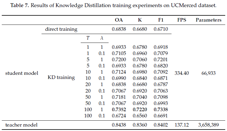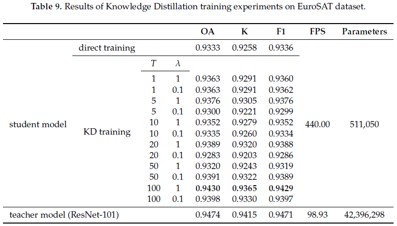 本文还在UCMerced数据集、NWPU-RESISC数据集、EuroSAT数据集三个数据集上进行实验,进一步验证知识蒸馏方法在低分辨率遥感影像、遥感地物类别较多、遥感影像数量较少等情况下的适用性与可行性,结果如表7-表9所示。