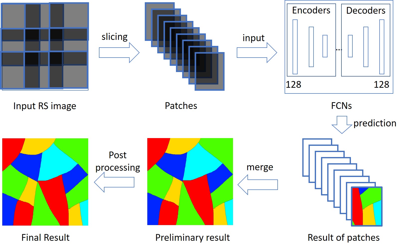 在本文语义分割框架中,将原始遥感影像按照一定的重叠度,切成$128\times128$的影像块(patches),通过网络预测(inference)出结果后,再按照投票法进行结果融合。完整过程如图1所示。本文后续实验将根据不同的重叠度来进行定量分析。