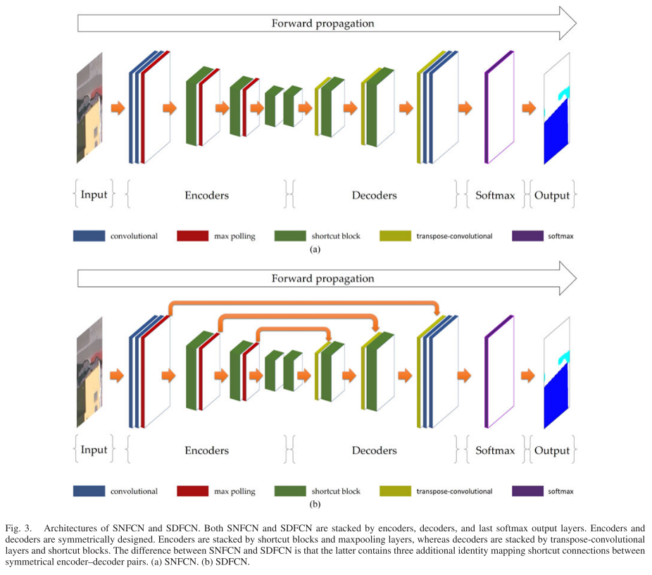 SNFCN由输入层、解码器、编码器、Softmax层与输出层组成。而SDFCN在此基础上,增加了编码器与解码器之间的shortcut连接。