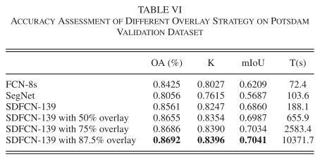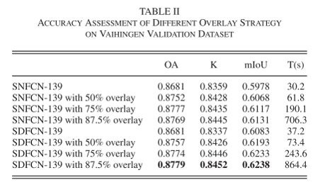 实验结果也表明,当重叠度达到75%时,已经能够取得较好分类成果。与FCN-8s/16s/32s、SegNet等经典FCN模型相比,SDFCN也表现得更好。